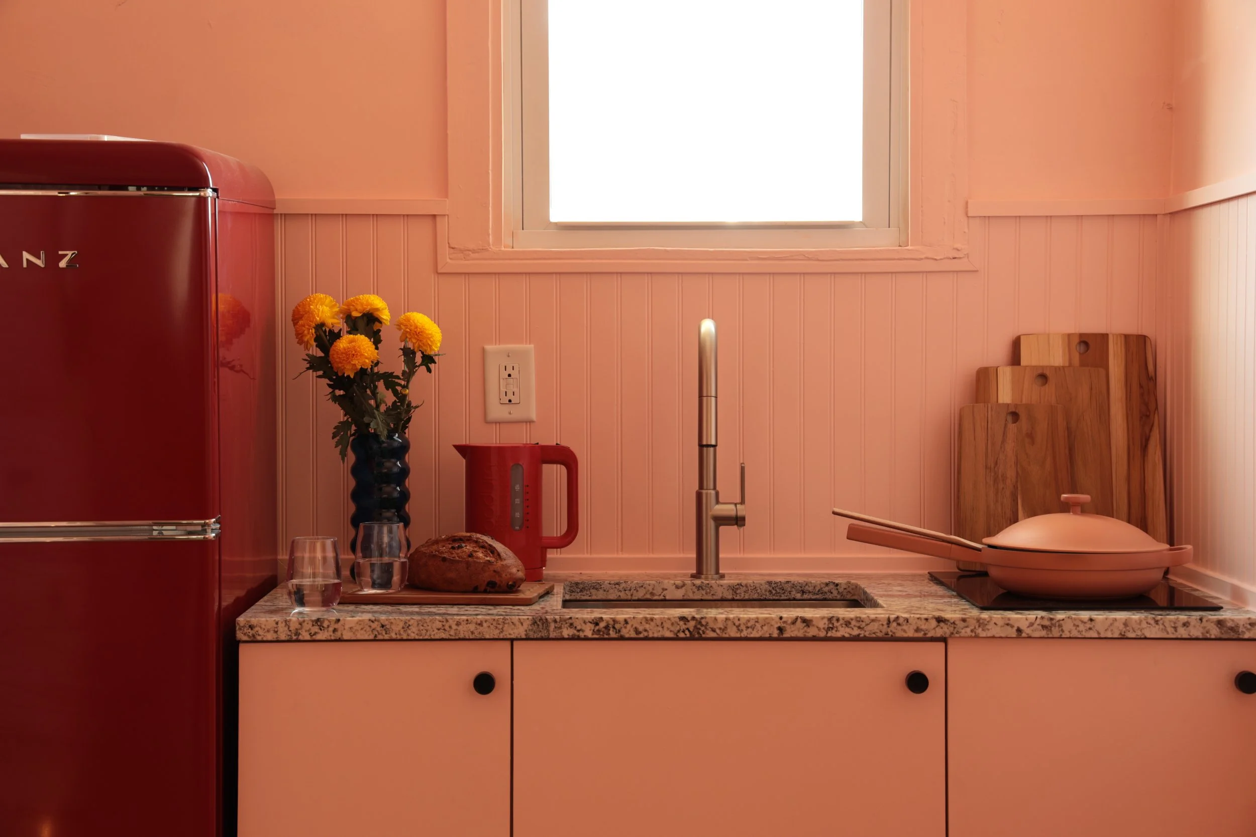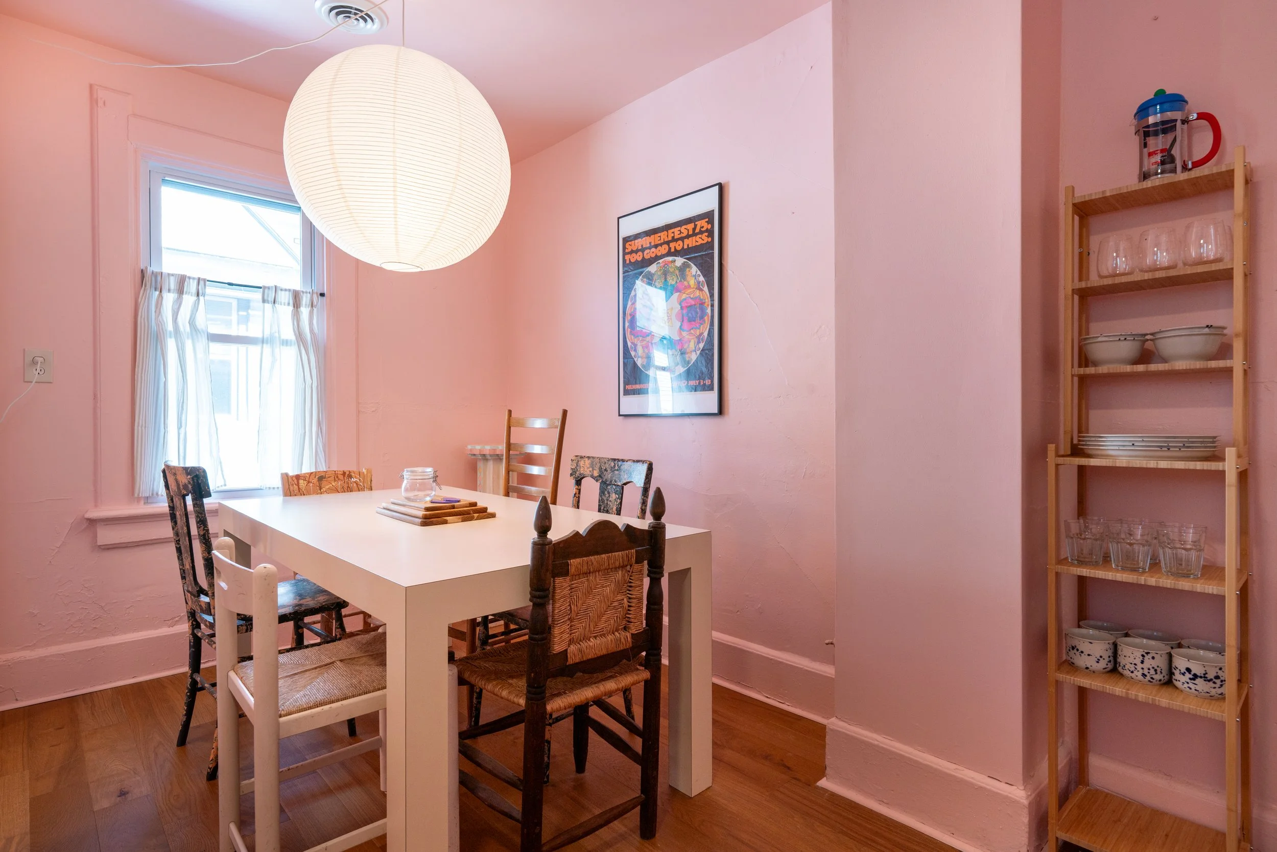 Named for Milwaukee’s iconic bridge, The Hoan leads you up a bold blue staircase into a golden-hued living room that practically glows. A cozy reading nook is tucked in for when you want to hide away with a book, while the kitchen and dining room are set up for actual dinners (or just late-night pizza). A modern bathroom, a restful bedroom with a desk, and thoughtful art throughout keep things feeling balanced. Like all our spaces, it’s layered with vintage finds, designer furniture, and fresh new pieces where it matters (beds, mattresses, couches). The Hoan sleeps four, and if you need more space, you can connect with The Sydney to host your whole crew up to twelve.